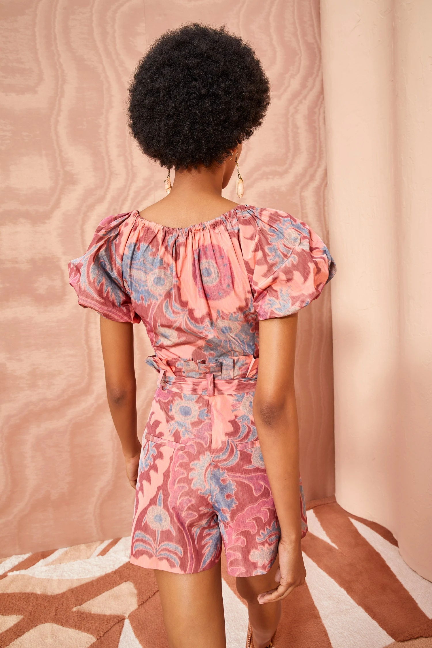The Abri Shorts are crafted in our warp printed floral taffeta, showcasing an antique floral motif pattern that features faded pink and blue tones. These open-leg shorts are designed to sit at the high waist and are finished with a single pleat, side pockets, and a removable matching belt.