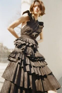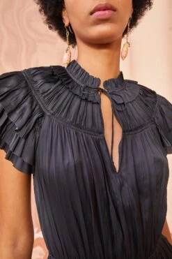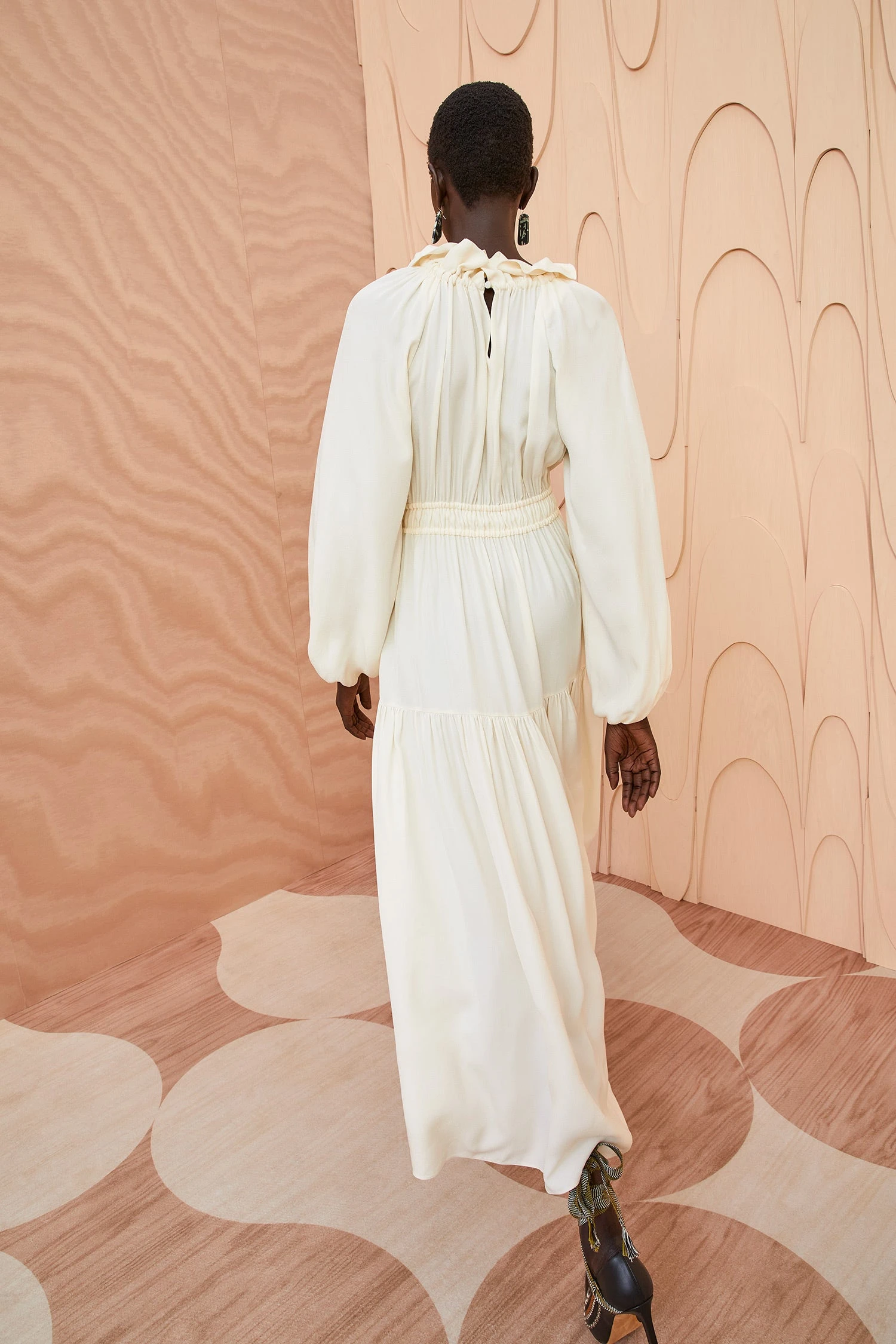 Made from our signature satin back crepe, the Annalisa Dress is an ethereal beauty in a shade of pearly white. This midi-length dress has ruffles that spill out elegantly at the neck, long voluminous sleeves, and is elasticated at the waist for comfort. It is finished with a back button keyhole.