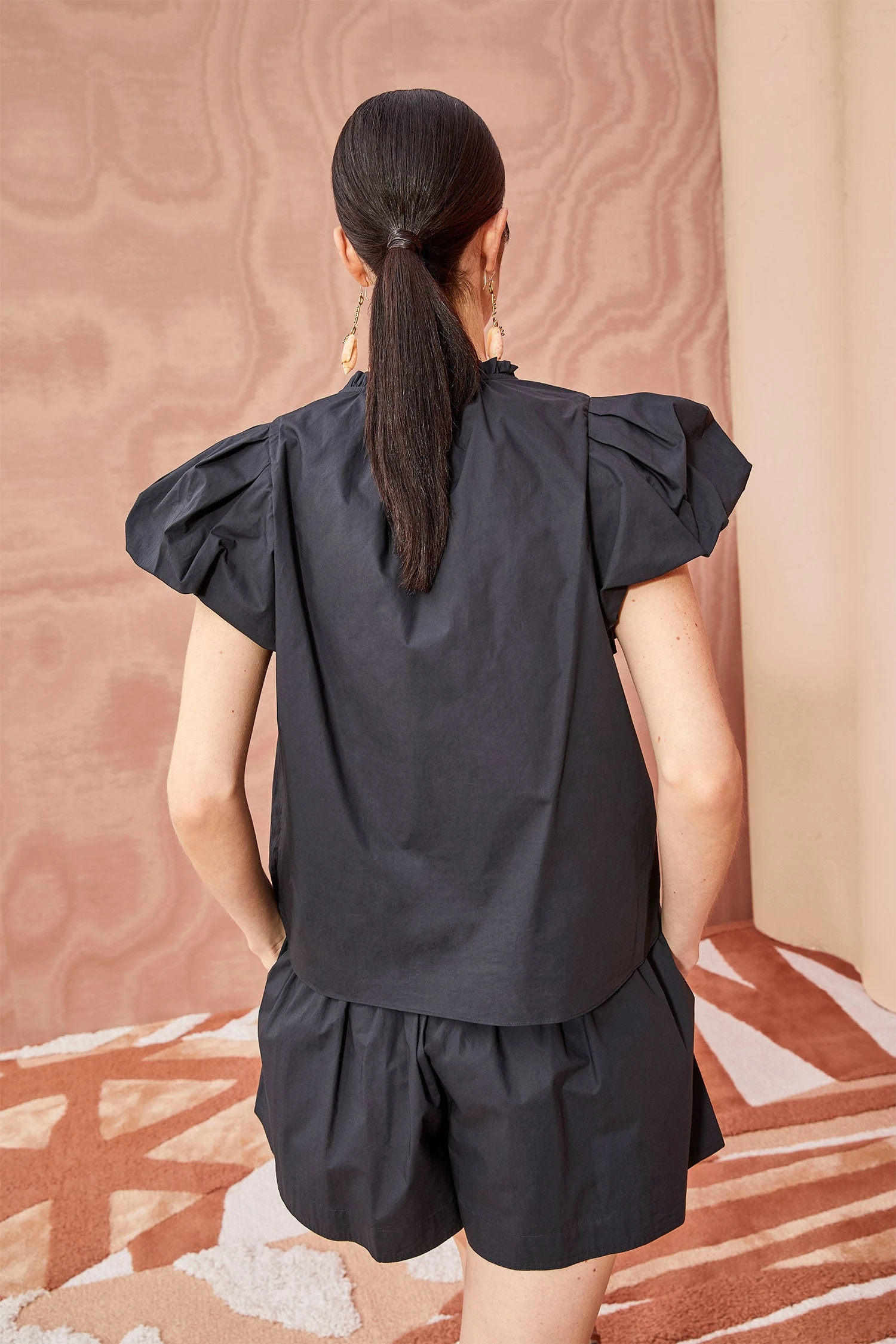 The Evelyn top is crafted from our signature cotton poplin in a classic black monochrome hue. This short-sleeved top features a split neckline and flutter sleeves.