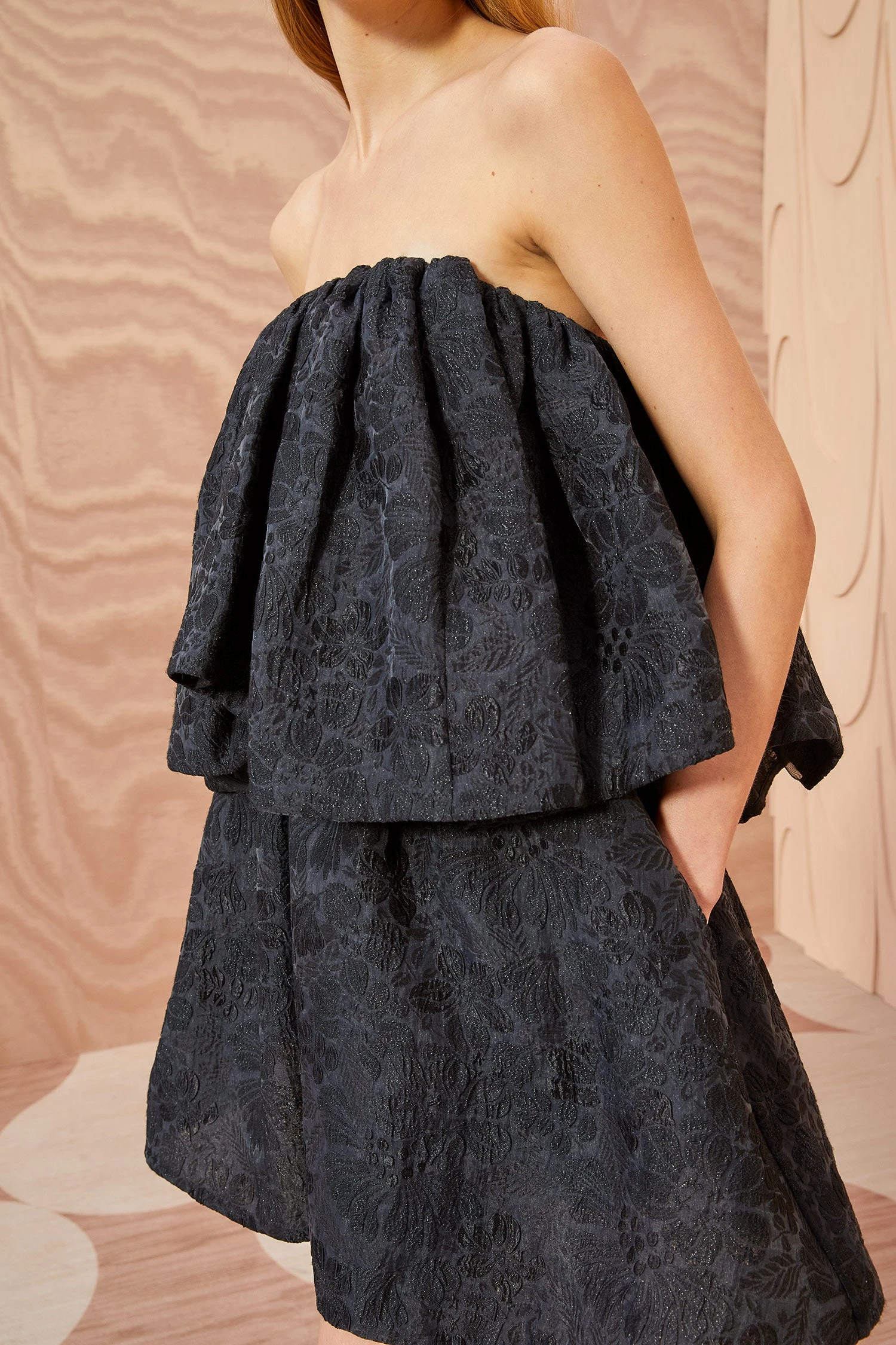 The event-ready Oui Dress is made from our luxurious cloqué jacquard in a beautiful moon flower motif. This impactful tiered mini dress features a strapless neckline, light boning within the top lining, and is finished with a side-seam zipper.